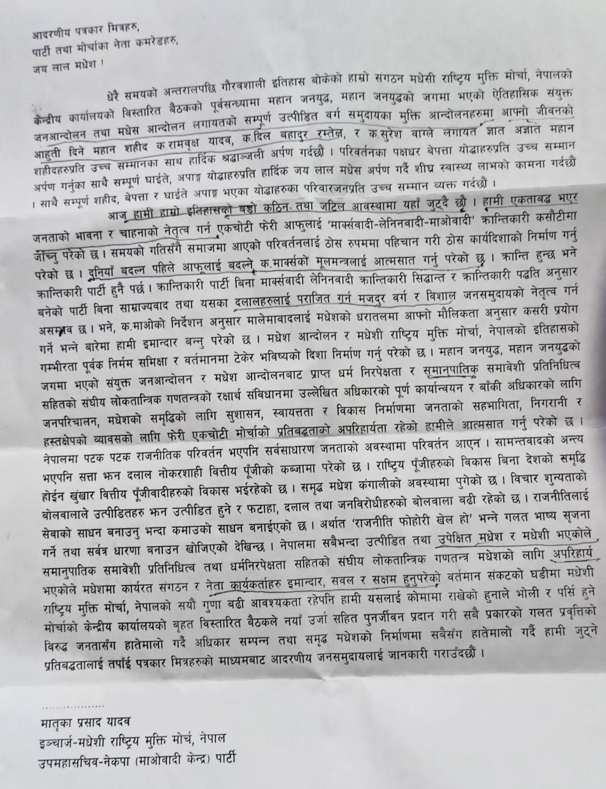 आदरणीय पत्रकार मित्रहरु, पार्टी तथा मोर्चाका नेता कमरेडहरु, जय लाल मधेश।