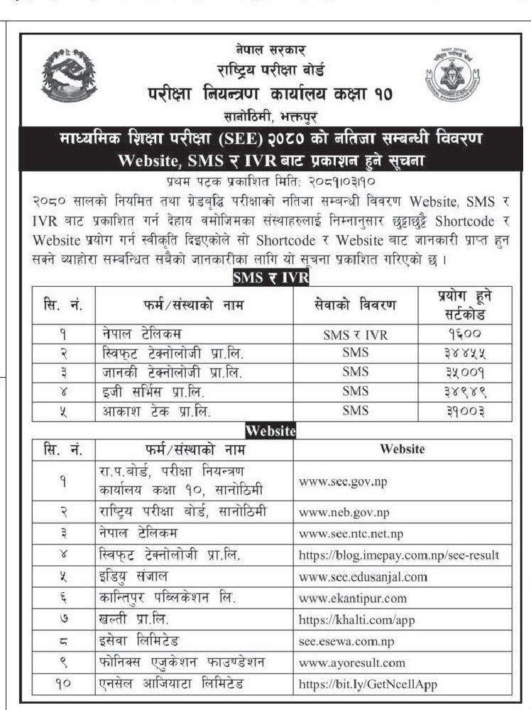 काठमाडौं । राष्ट्रिय परीक्षा बोर्डले माध्यामिक शिक्षा परीक्षा (एसईई)–२०८० को नतिजा सार्वजनिक गरेको छ । बोर्डले यसपटकदेखि नयाँ लेटर ग्रेडिङ’ प्रणालीअनुसार नतिजा सार्वजनिक गरेको हो ।