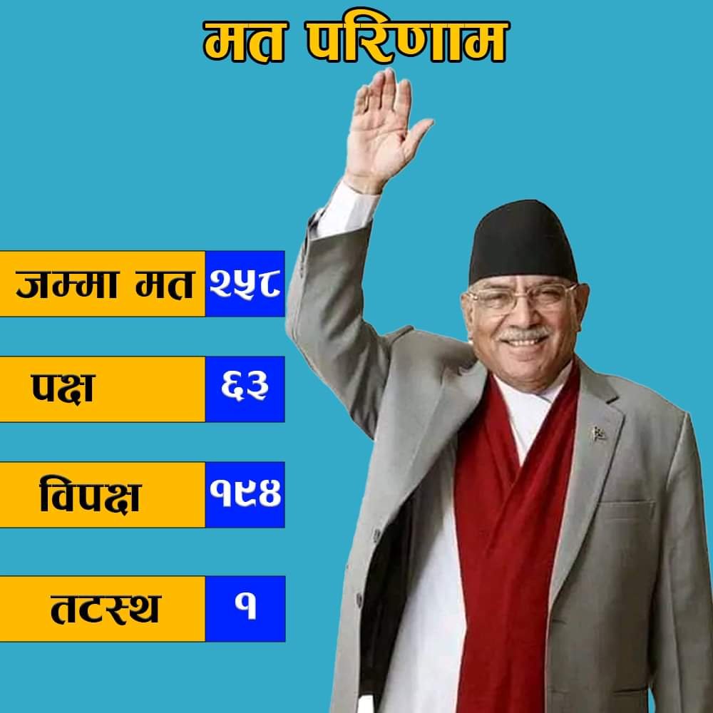 २७५ सदस्यीय प्रतिनिधि सभामा बहुमतका लागि १३८ मत चाहिन्छ । तर प्रधानमन्त्री प्रचण्डको पक्षमा ६३ मत मात्र पर्‍यो । उनको विपक्षमा १९४ मत परेको छ । र मत दिन्न भन्नेमा १ मत परेको छ । आजको बैठकमा २५८ जना सांसदको उपस्थिति रहेको थियो ।