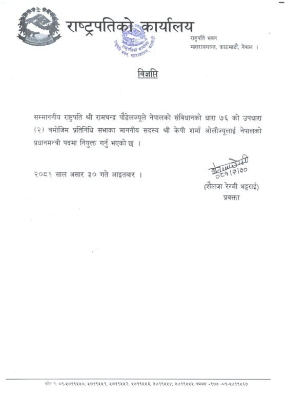 काठमाडौं । प्रधानमन्त्रीमा केपी शर्मा ओली प्रधानमन्त्रीमा नियुक्त नियुक्त हुनुभएको छ। आइतबार राष्ट्रपति रामचन्द्र पौडेलले संविधानको धारा ७६(२) अनुसार ओलीलाई प्रधानमन्त्री नियुक्त गरेका हुन् ।