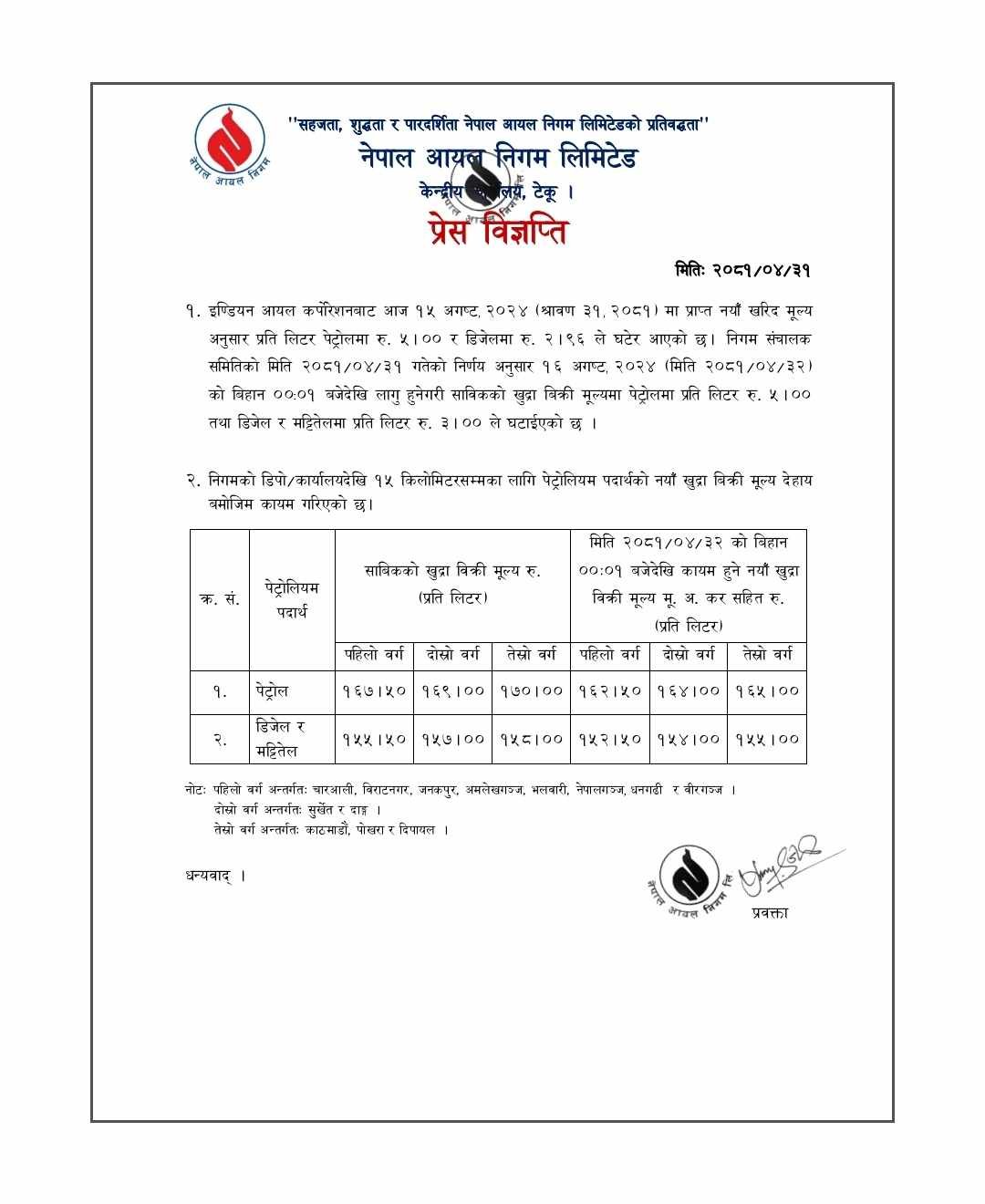इण्डियन आयल कर्पोरेसनबाट नयाँ खरिद मूल्य कायम भएर आएअनुसार निगमले विहिबार राति देखि लागू हुने गरी पेट्रोलमा प्रति लिटर ५ रुपैयाँ तथा डिजेल र मट्टितेलमा प्रति लिटर ३ रुपैयाँले मूल्य घटाएको हो ।