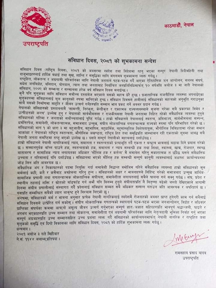 उनले राजनीतिक दल, नेतृत्व, सरकार र सम्पूर्ण राज्यसत्तालाई संविधान दिवसले अझ लोकतान्त्रिक, न्यायपूर्ण र परिणाममुखी बनाउने दायित्व बोध गराउने विश्वास व्यक्त गरेका छन् ।