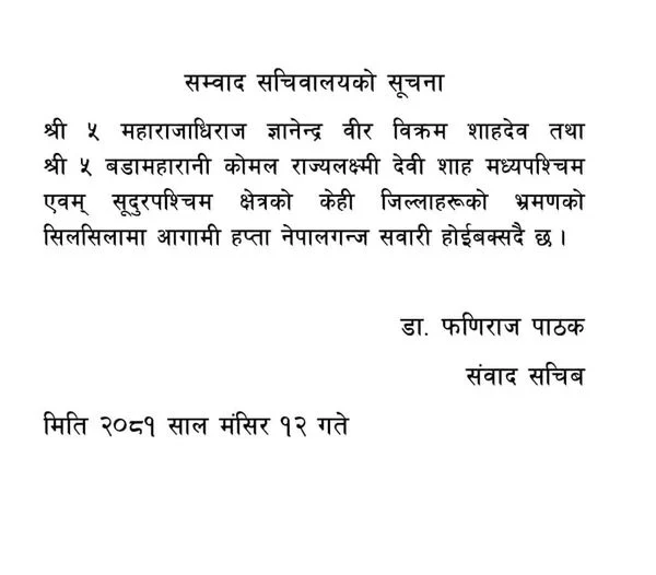 पूर्व राजाको सम्वाद सचिवालयका अनुसार पूर्व रानी कोमल शाहको साथ ज्ञानेन्द्र मध्यपश्चिम एवम् सुदूरपश्चिम क्षेत्रको केही जिल्लाहरूको भ्रमणको सिलसिलामा आगामी हप्ता नेपालगन्ज जाने कार्यतालिका छन् ।