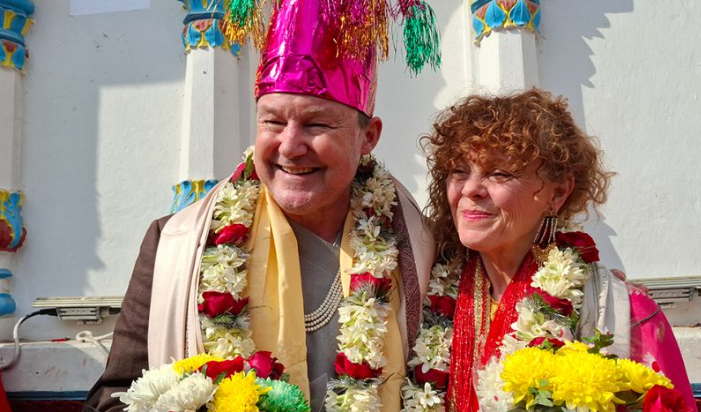 जनकपुरधाम । नेपालका लागि बेलायती राजदूत रब फेनले जनकपुर स्थित जानकी मन्दिरमा श्रीमती जुलिया फेनसँग आफ्नो २२ औं वैवाहिक वर्षगाठ मनाएका छन् । उनी मैथिली परम्परा अनुसार मालाफेर र सिन्दुर लगाएर वैवाहिक वर्षगाँठ मनाएका हुन् ।