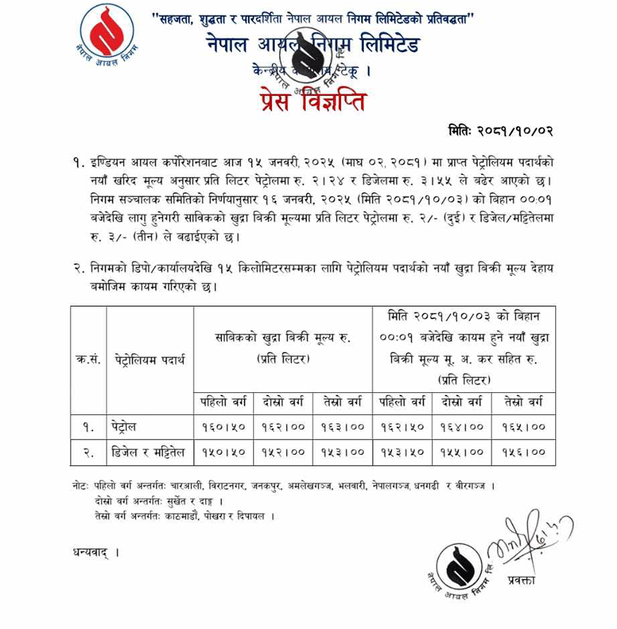 निगम सञ्चालक समितिको निर्णयानुसार पेट्रोल, डिजेल र मट्टीतेलको मूल्य बुधबार राति १२ बजेपछि लागु हुनेछ ।