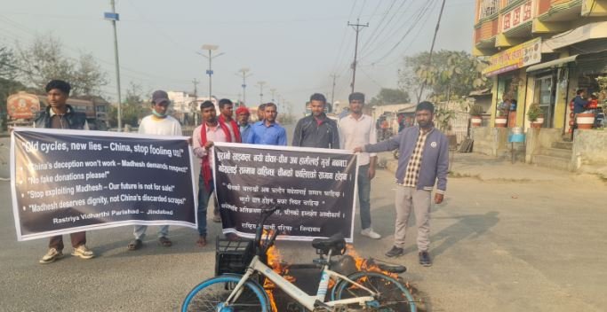 बीरगंज । बीरगंजमा चिनियाँ सहयोगको नाममा पुराना र कमसल साइकल वितरण गरिएको विरोधमा राष्ट्रिय विद्यार्थी परिषद् बीरगंजले लक्ष्मणवा (प्रतिमा )चौकमा प्रदर्शन गर्दै साइकल जलाएका छन्। प्रदर्शनकारीहरूले “चीनको चलाखी अब चल्दैन – मधेसलाई सम्मान चाहिन्छ!” र “पुरानो साइकल, नयाँ धोका – चीन, अब हामीलाई मूर्ख नबनाउ!” जस्ता नाराहरू लगाउँदै विरोध जनाए ।