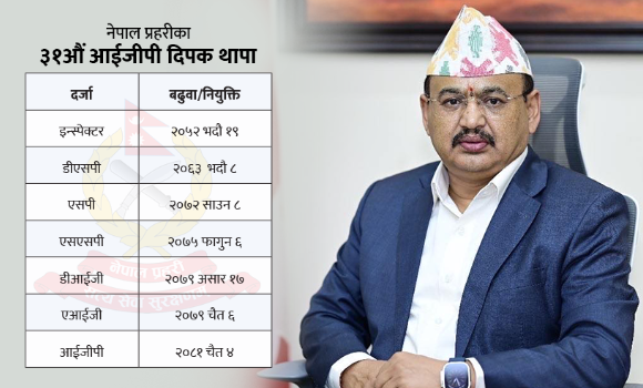 काठमाडौं । नेपाल प्रहरीको ३१औं प्रहरी प्रमुख (प्रहरी महानिरीक्षक)मा दिपक थापा नियुक्त भएका छन् ।