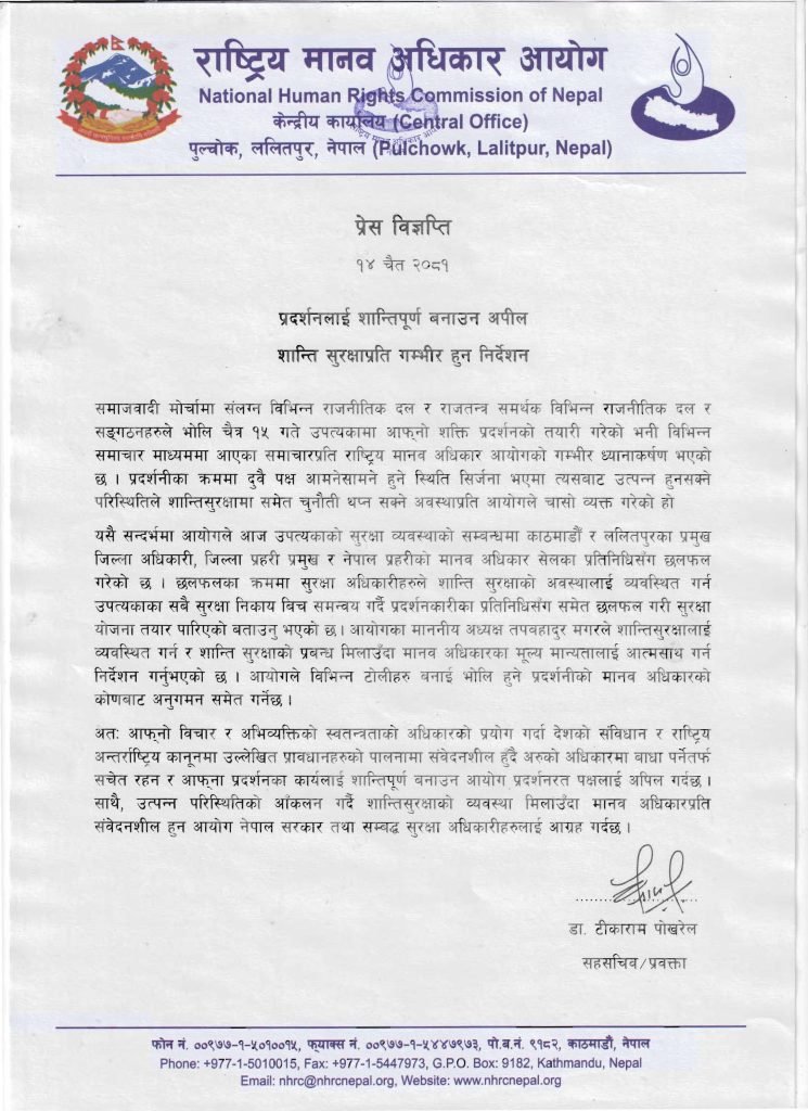 प्रदर्शनका क्रममा दुवै पक्ष आमनेसामने हुने स्थिति सिर्जना भएमा त्यसबाट उत्पन्न हुनसक्ने परिस्थितिले शान्ति सुरक्षामा समेत चुनौती थप्न सक्ने अवस्थाप्रति आयोगले विज्ञप्तिमार्फत चासो राखेको छ ।