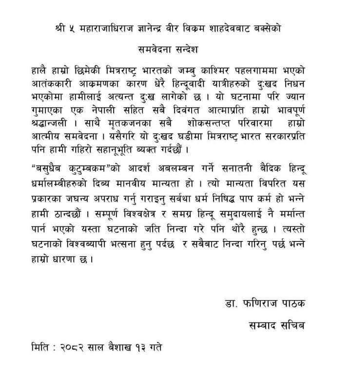 पूर्वराजा शाहले भनेका छन् । हालै हाम्रो छिमेकी मित्रराष्ट्र भारतको जम्बु काश्मीर पहलगाममा भएको आतंककारी आक्रमणका कारण धेरै हिन्दुवादी यात्रीहरूको दुःखद निधन भएकोमा हामीलाई अत्यन्तै दुःख लागेको छ ।