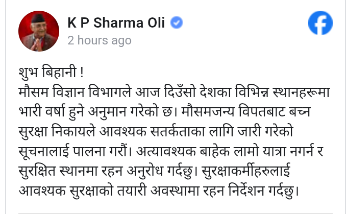 प्र.म.ओलीले सामाजिक सञ्जालमा लेखेका छन्, ‘मौसम विज्ञान विभागले आज दिउँसो देशका विभिन्न स्थानहरूमा भारी वर्षा हुने अनुमान गरेको छ । मौसमजन्य विपतबाट बच्न सुरक्षा निकायले आवश्यक सतर्कताका लागि जारी गरेको सूचनालाई पालना गरौँ। अत्यावश्यक बाहेक लामो यात्रा नगर्न र सुरक्षित स्थानमा रहन अनुरोध गर्दछु।’ सुरक्षाकर्मीहरूलाई आवश्यक सुरक्षाको लागि तयारी अवस्थामा रहन पनि उनले निर्देशन दिएका छन् ।