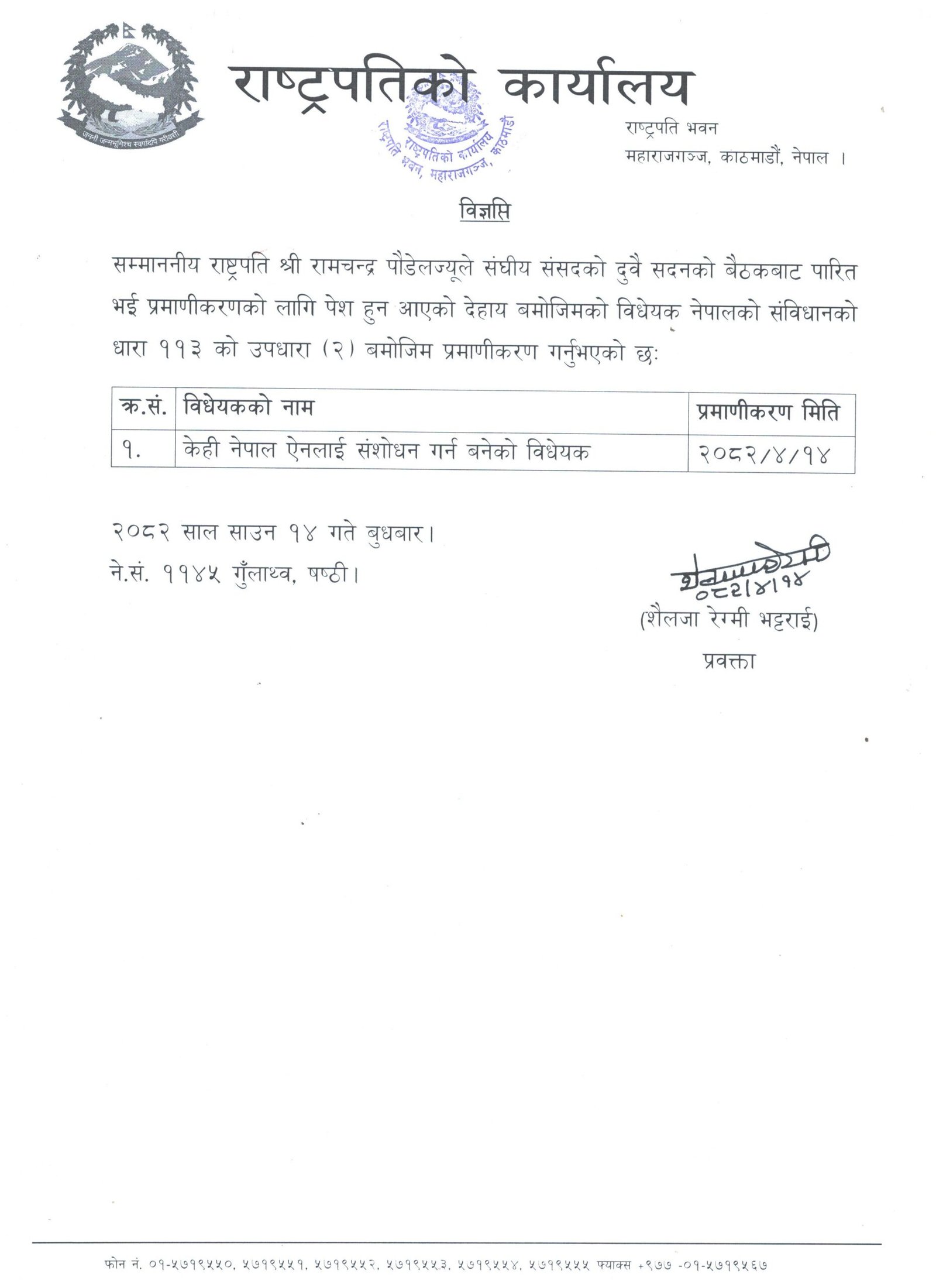 ‘राष्ट्रपति रामचन्द्र पौडेलले संघीय संसदको दुवै सदनको बैठकबाट पारित भई प्रमणीकरणको लागि पेस हुन आएको विधेयक नेपालको संविधानको धारा ११३ को उपधारा २ बमोजिम प्रमाणीकरण गर्नुभएको राष्ट्रपति कार्यालयकी प्रवक्ता शैलजा रेग्मी भट्टराईले जारी गरेको विज्ञप्तिमा उल्लेख छ ।