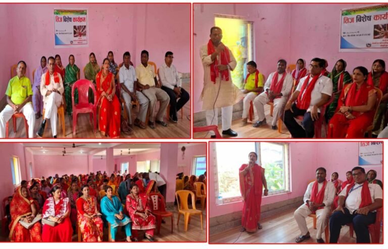 पोखरिया नगरपालीकाको नगर उप प्रमुख रुवी कुमारी ठाकुरको अध्यक्ष्तामा भएको तिज विशेष तथा महिलाहरुलाई दर खुवाई कार्यक्रमको प्रमुख अतिथी नगर प्रमुख प्रदुमन प्रसाद चौहान ,वडा अध्यक्ष लक्ष्मण साह कानु ,कार्यपालीका सदस्य राधा साह कानु , पोखरिया नगरपालीकाको प्रमुख प्रसासकिय अधिकृत रामवीनय कुमार सिँह , स्वास्थय साखा प्रमुख कौहलेन्द्र मिश्रा, शिक्षा साखा सहायक लालन पटेल ,जिन्सी साखा सहायक भगवान साह कानु, शिक्षक पारस ठाकुर, समाज सेवी दिपक ठाकुर ,निरज ठाकुर सँचारकर्मी लगायतकाहरुको सहभागीता रहेको कार्यक्रमको सहजीकरण शिव पटेलले गरेका हुन ।