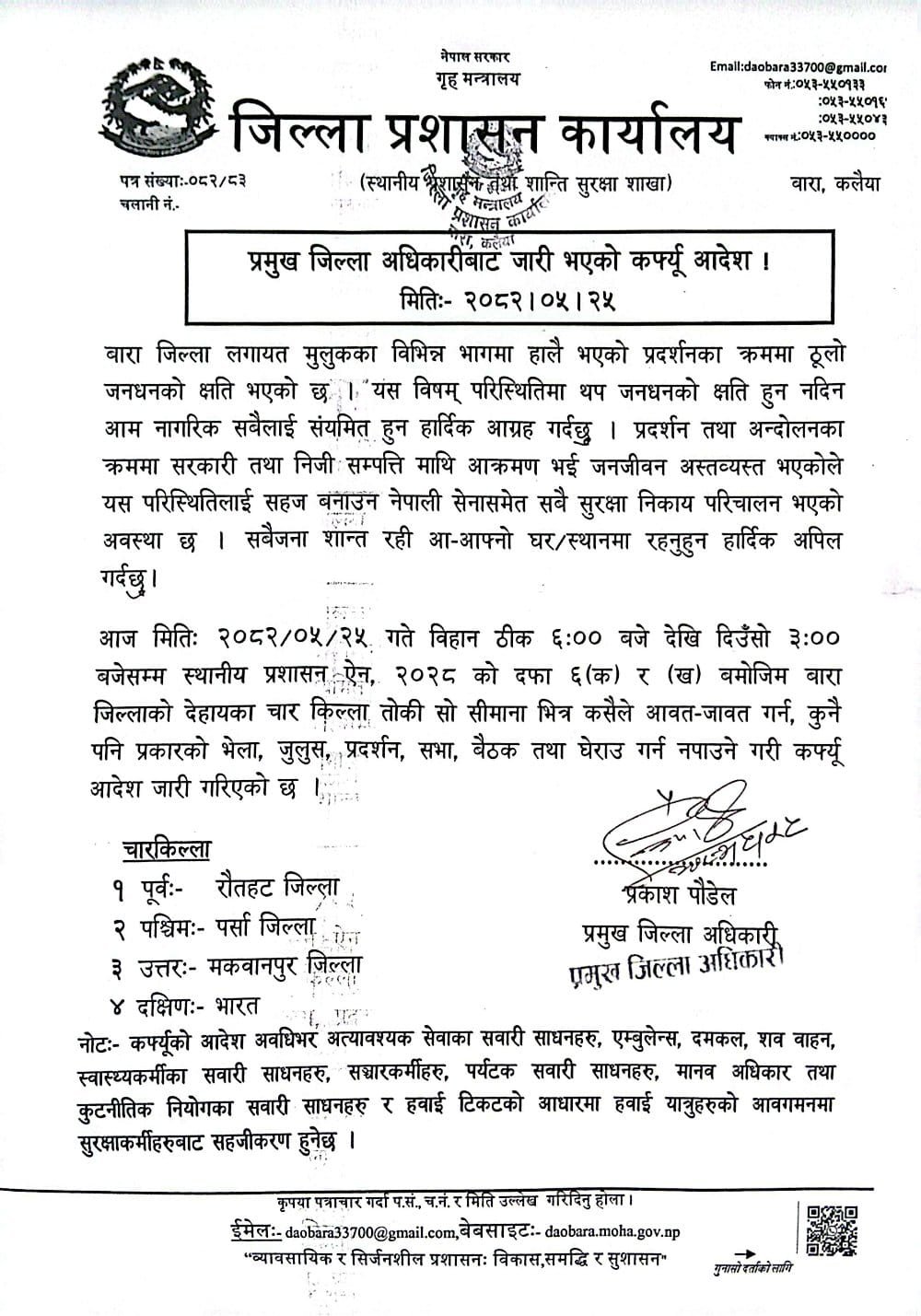 बाराका प्रमुख जिल्ला अधिकारी प्रकाश पौडेलबाट जारी विज्ञप्तिअनुसार, स्थानीय प्रशासन ऐन, २०२८ को दफा ६ (क) र (ख) बमोजिम यो आदेश लागू गरिएको हो। यस विषम परिस्थितिमा शान्ति सुरक्षा कायम गर्न नेपाली सेनासहित सबै सुरक्षा निकाय परिचालन गरिएको छ।