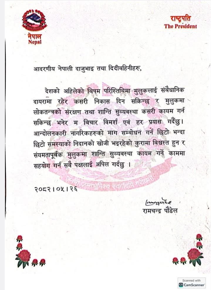 राष्ट्रपति रामचन्द्र पौडेलले मुलुकको वर्तमान विषम परिस्थितिमा सबै पक्षलाई संयमता अपनाउन आग्रह गर्दै शान्ति र सुव्यवस्था कायम गर्न सहयोगको लागि अपिल गरेका छन्। बिहीबार एक विज्ञप्ति जारी गर्दै उनले देशलाई संवैधानिक दायराभित्र रहेर निकास दिने प्रयास भइरहेको जानकारी दिएका छन्।
