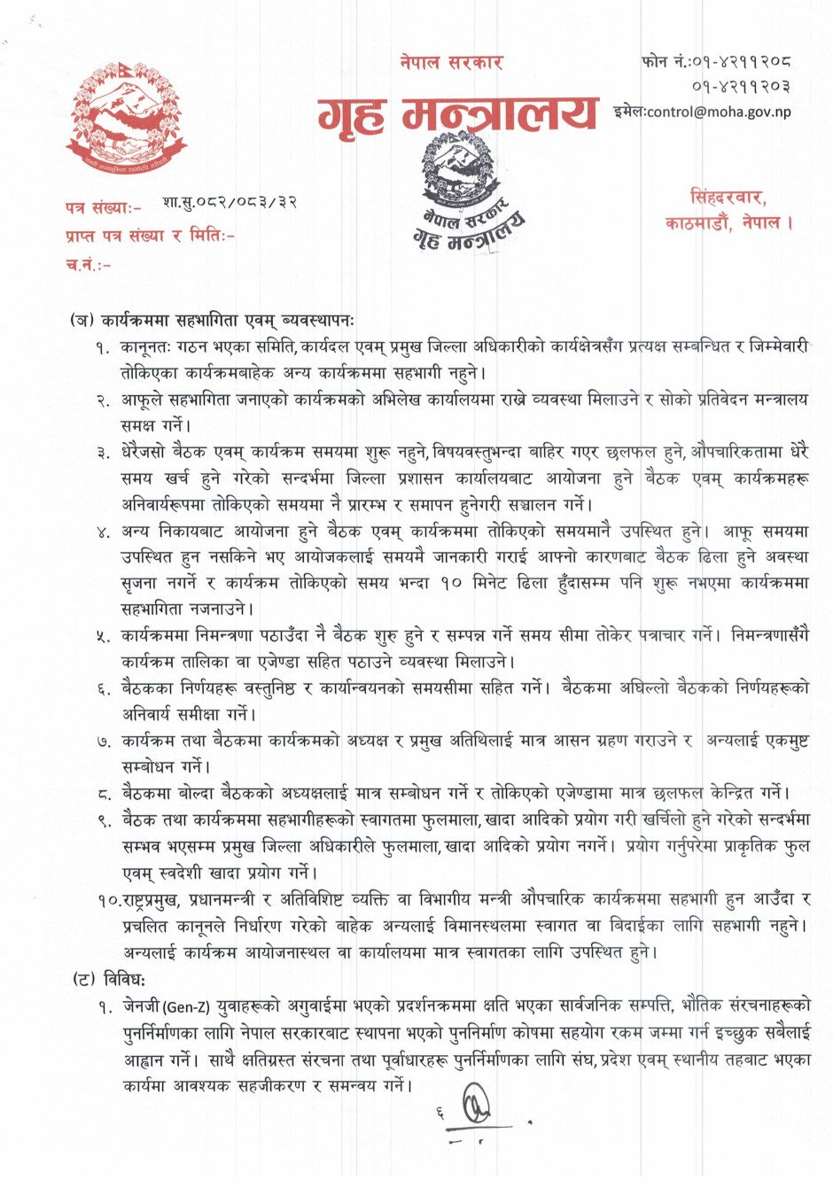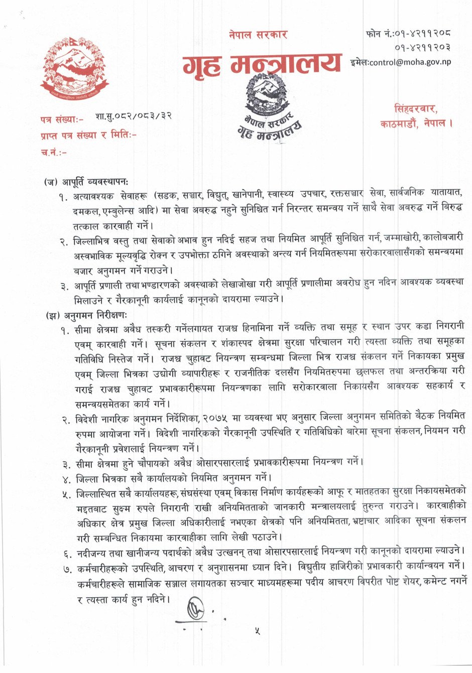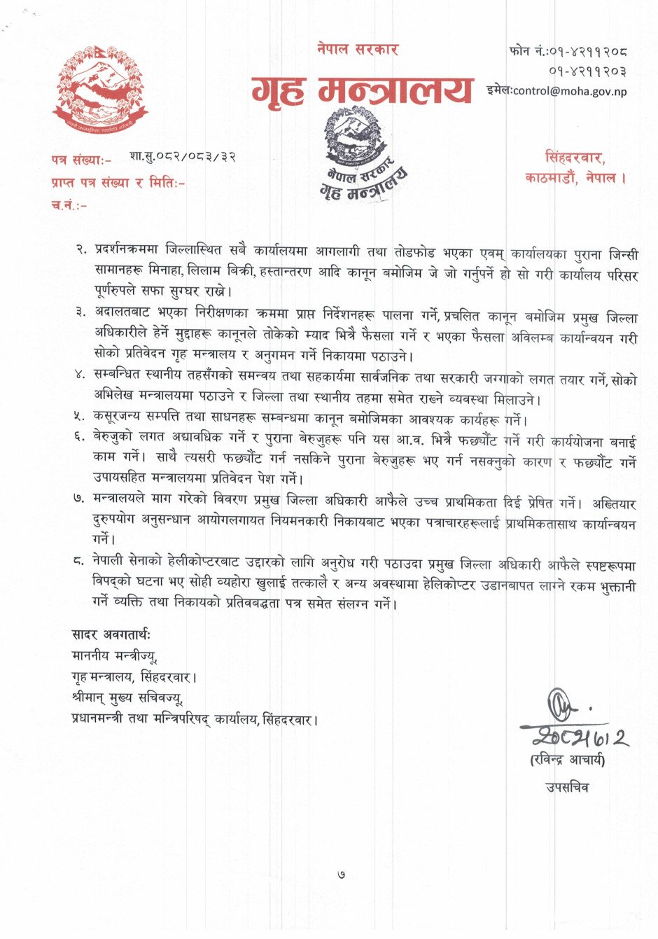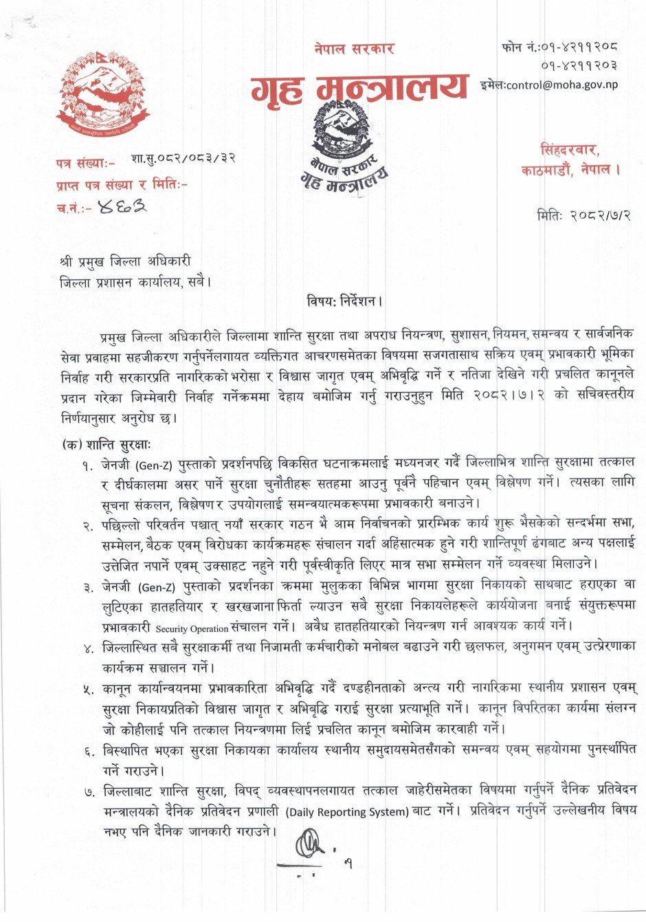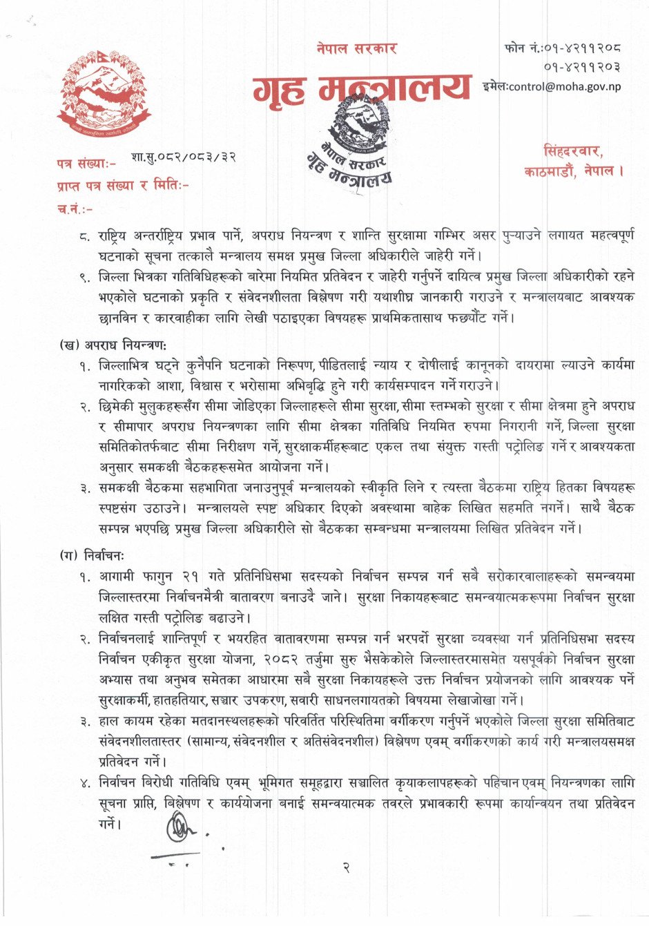 गृह सचिव दंगालले शान्ति सुरक्षा शीर्षकमा ९ बुँदामा, अपराध नियन्त्रण शीर्षकमा ३ बुँदामा, निर्वाचन सम्बन्धमा ५ बुँदामा निर्देशन दिएका छन् ।