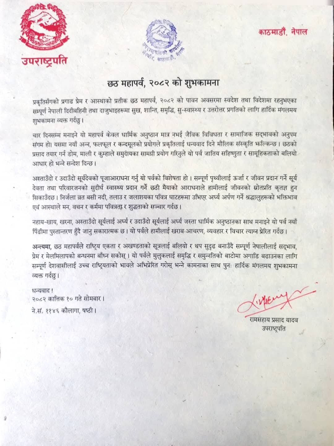उपराष्ट्रपति रामसहाय यादव द्वारा छठ पर्वको शुभकामना