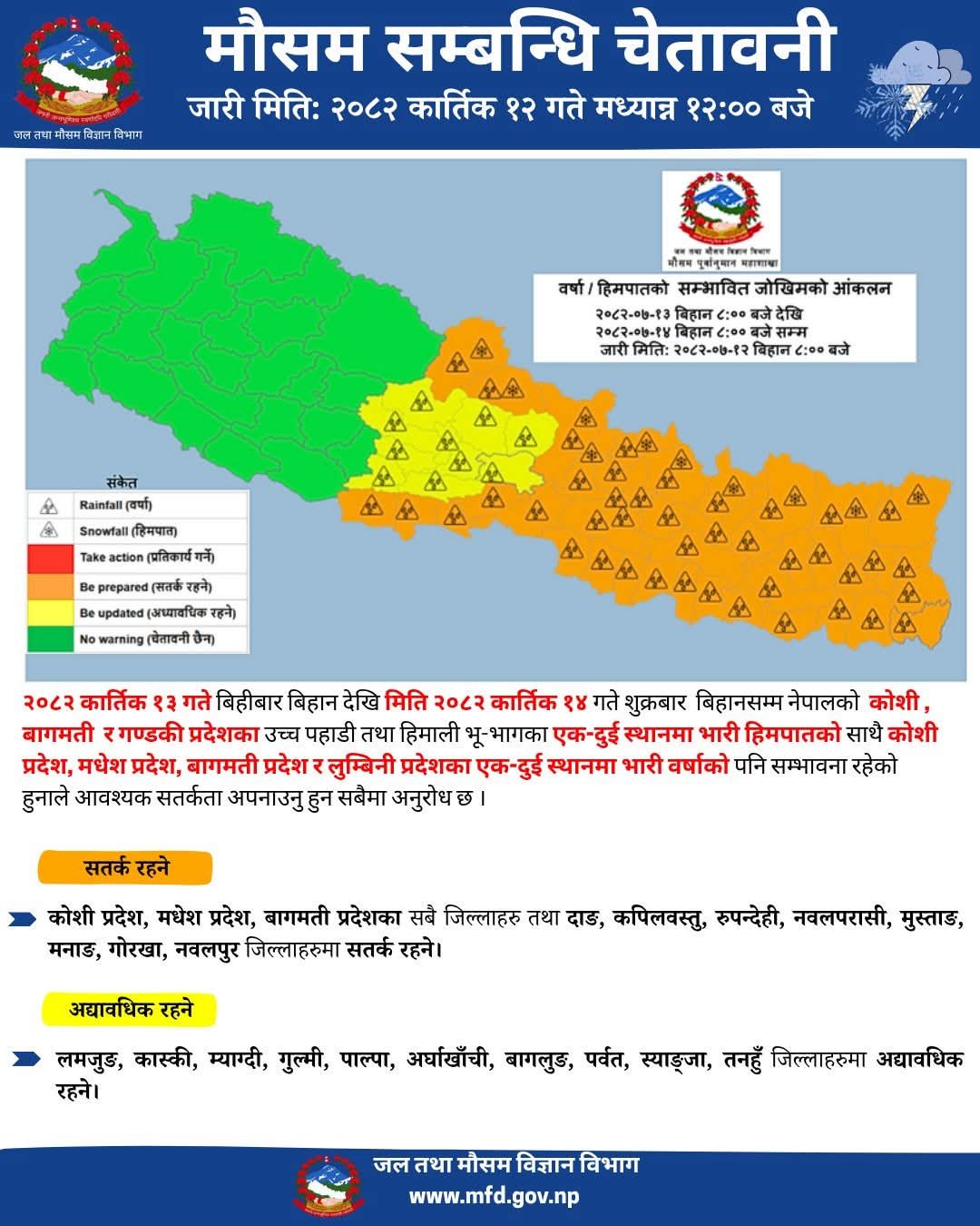 जल तथा मौसम विज्ञान विभागका अनुसार बिहीबारदेखि शनिबारसम्म मध्यमदेखि भारी वर्षा हुन सक्ने अनुमान गरिएको छ। यस अवस्थामा सर्वसाधारणलाई सचेत रहन आग्रह गर्दै मुख्यमन्त्री सोनलले भने, “प्रदेश सरकार विपद् जोखिम न्यूनीकरणका लागि उच्च सतर्कतामा छ र आवश्यक सबै संयन्त्र परिचालन गर्नमा तयार छ।”