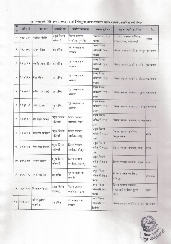 गृह मन्त्रालयमा रहेका सहसचिवहरू राजन पौडेललाई भोजपुर, लक्ष्मीप्रसाद पौडेललाई पर्वत, रेखा कँडेललाई खोटाङ, शान्तिराम प्रसाईलाई प्युठान, उमेश ढुङ्गानालाई लमजुङमा सीडीओको जिम्मेवारी दिइएको छ ।