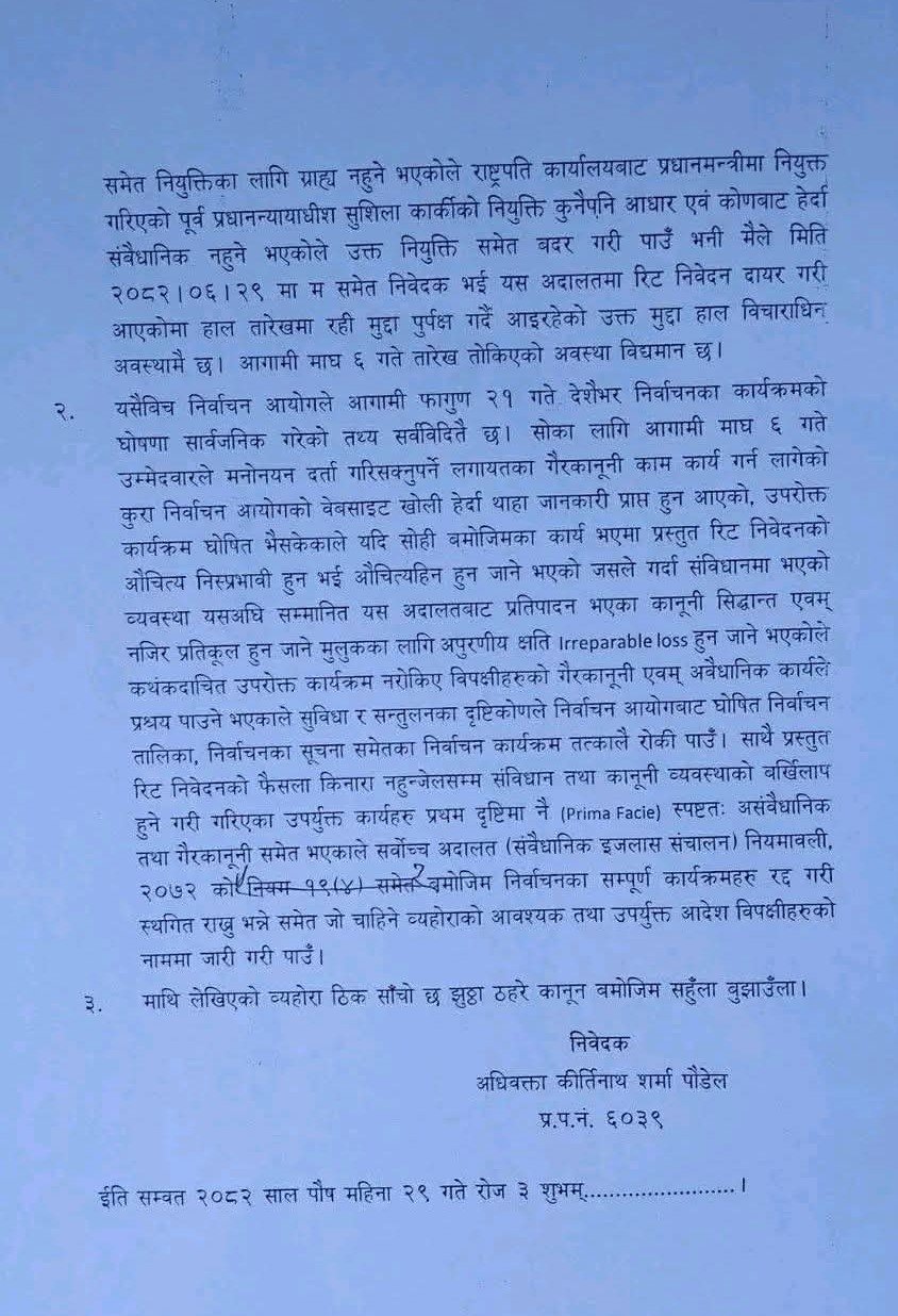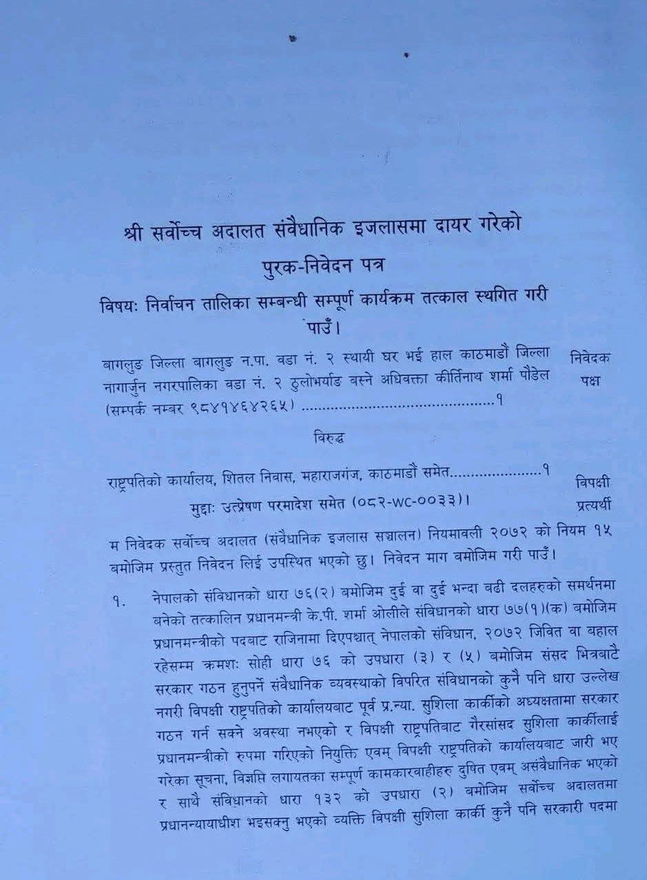अधिवक्ता कीर्तिनाथ शर्मा पौडेलले राष्ट्रपति कार्यालय र प्रधानमन्त्री कार्यालयलाई विपक्षी बनाएर मंगलबार रिट पेस गरेका हुन् ।उनले निर्वाचन तालिका सम्बन्धी सम्पूर्ण कार्यक्रम तत्काल स्थगितको माग गरेका छन् ।