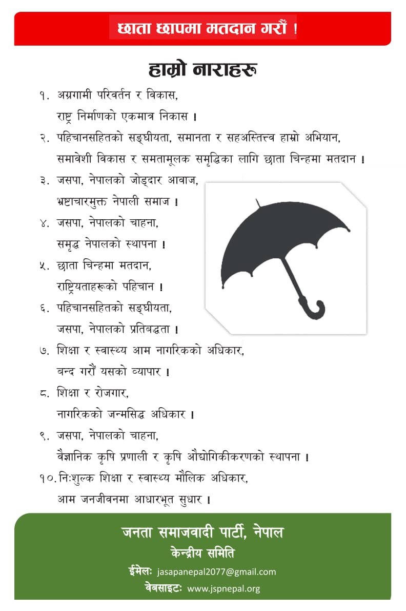 काठमाडौं । जनता समाजवादी पार्टी नेपालले फागुन २१ गते चुनावी घोषणापत्र सार्वजनिक गरेको छ।