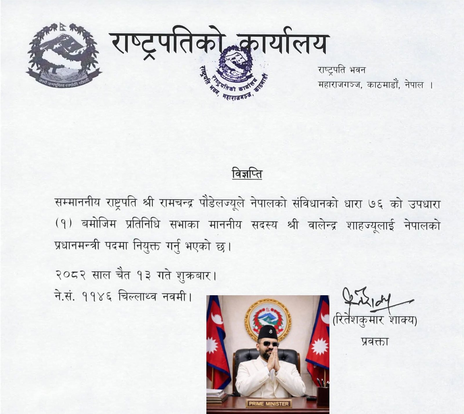 काठमाडौं । राष्ट्रपति रामचन्द्र पौडेलले प्रधानमन्त्रीमा रास्वपा संसदीय दलका नेता बालेन्द्र शाह (बालेन)लाई नियुक्त गरेका छन् ।