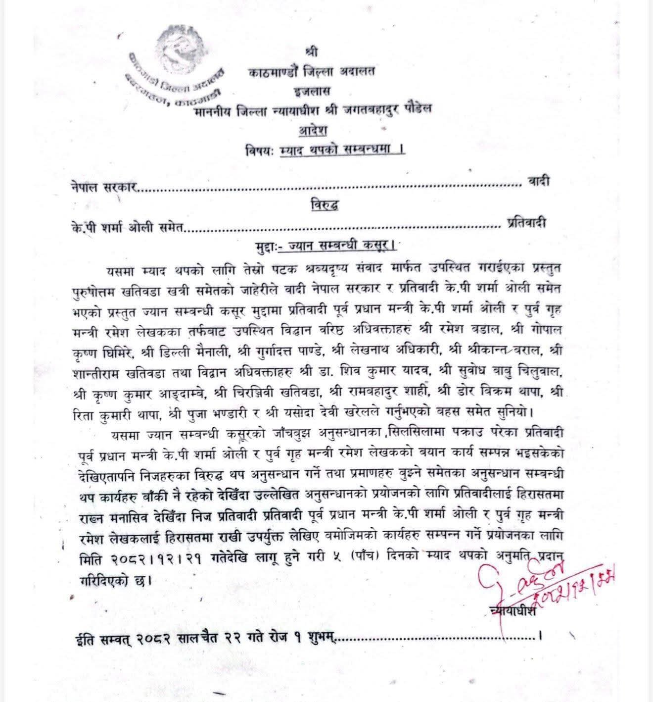 २२ चैत, काठमाडौं । काठमाडौं जिल्ला अदालतले आइतबार पूर्वप्रधानमन्त्री एवम् नेकपा एमालेका अध्यक्ष केपी शर्मा ओली र पूर्वगृहमन्त्री तथा नेपाली कांग्रेसका नेता रमेश लेखकलाई ५ दिन हिरासतमा राखेर अनुसन्धान गर्न म्याद थप गरिएको छ ।