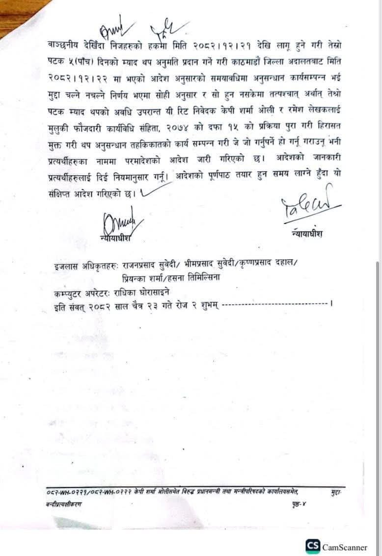 २३ चैत, काठमाडौं । सर्वोच्च अदालतले पूर्वप्रधानमन्त्री केपी शर्मा ओली र तत्कालीन गृहमन्त्री रमेश लेखक माथी २५ गते सम्म अनुसन्धान गरिसक्न परमादेश दिएको छ ।
