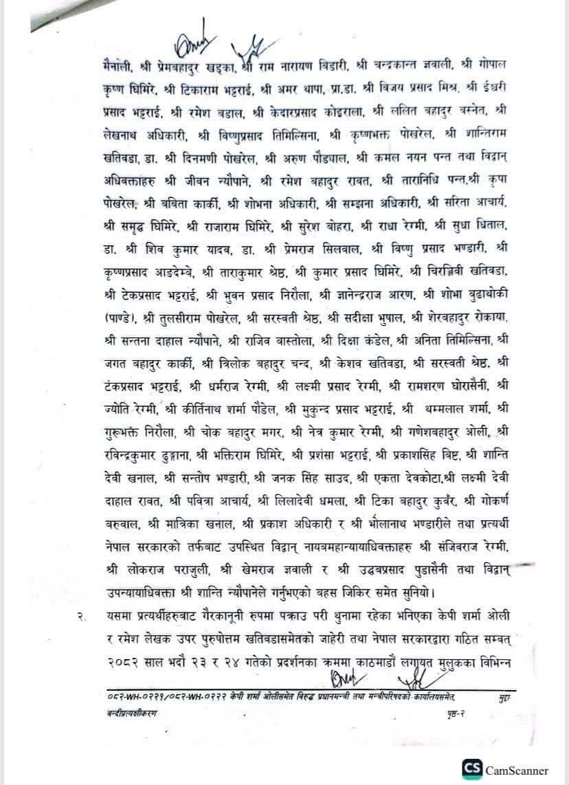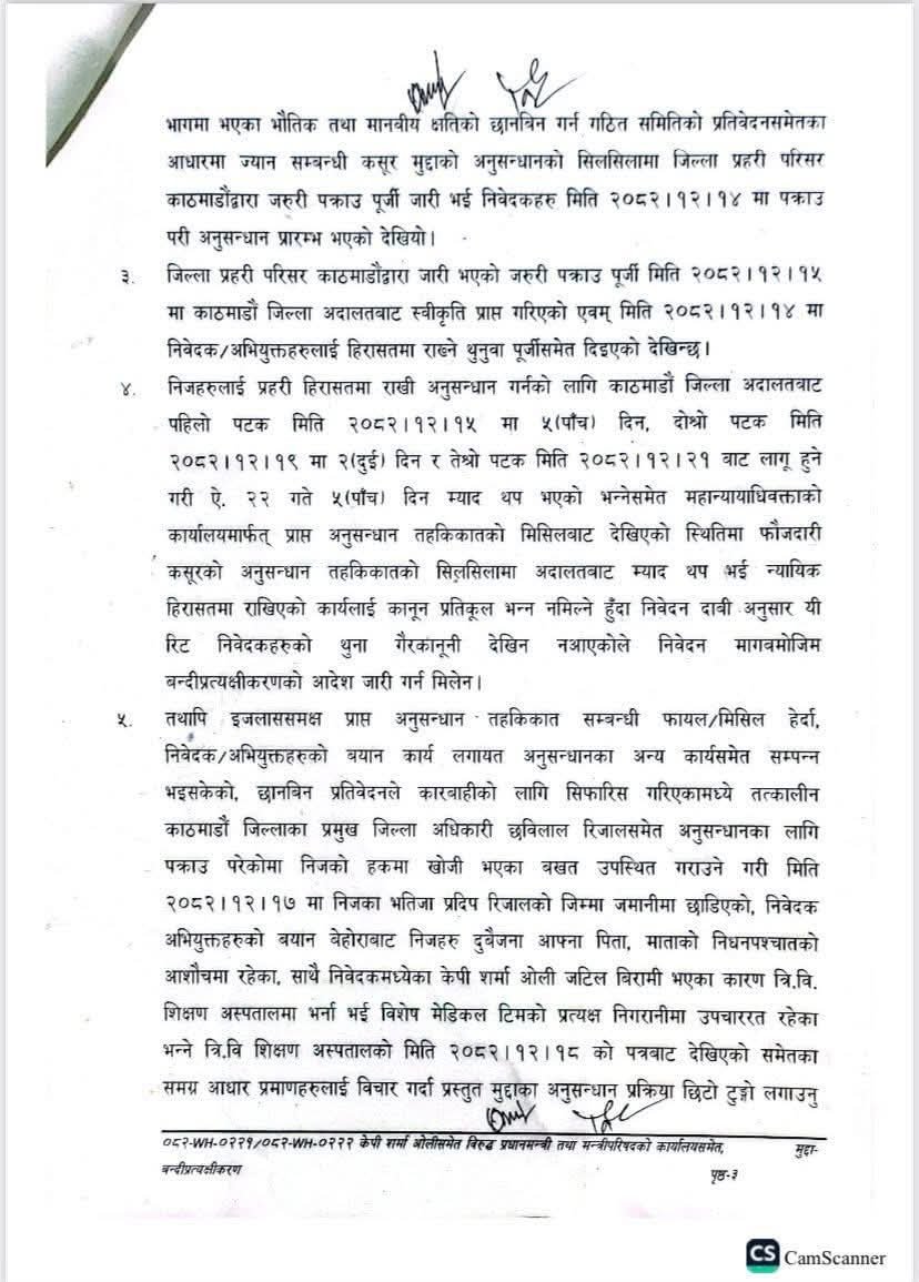 २३ चैत, काठमाडौं । सर्वोच्च अदालतले पूर्वप्रधानमन्त्री केपी शर्मा ओली र तत्कालीन गृहमन्त्री रमेश लेखक माथी २५ गते सम्म अनुसन्धान गरिसक्न परमादेश दिएको छ ।