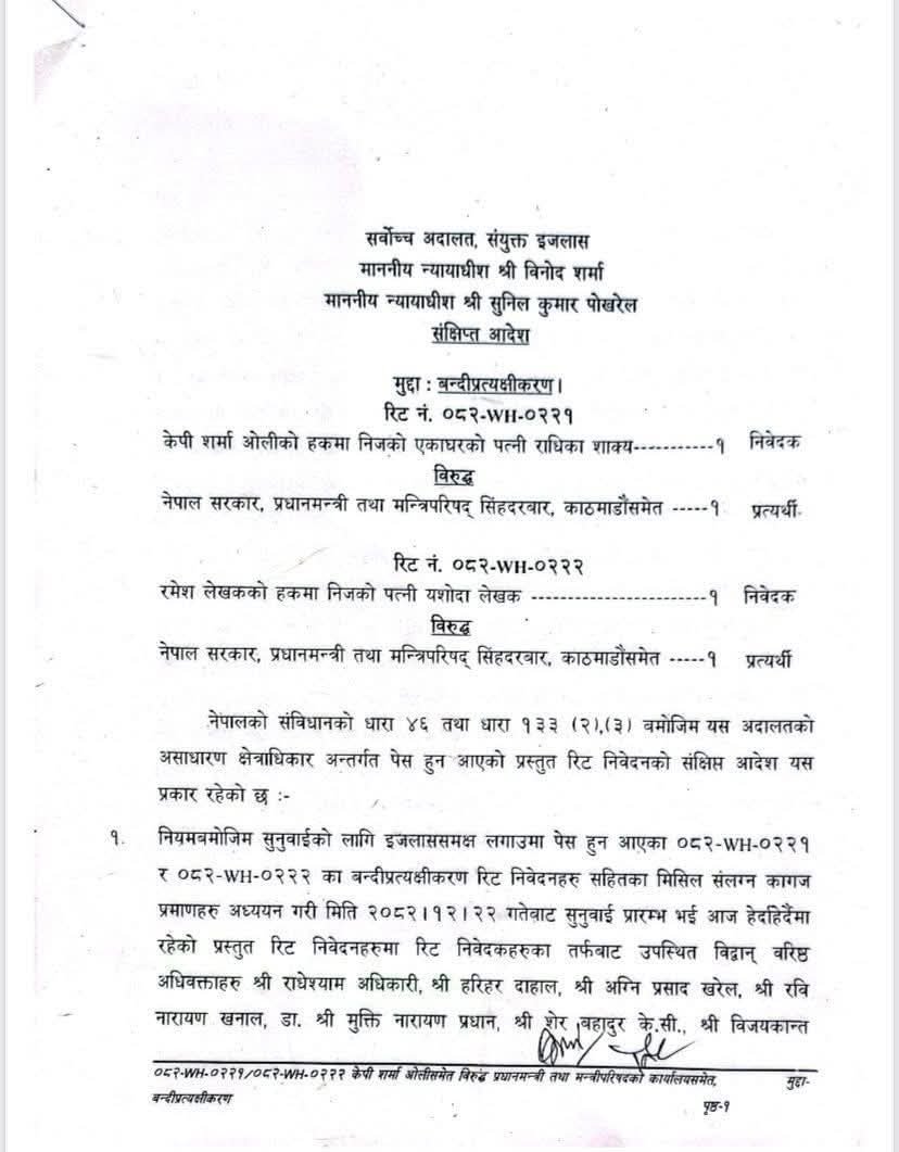 ओली र लेखकलाई रिहा गर्न सर्वोच्च अदालतको आदेश